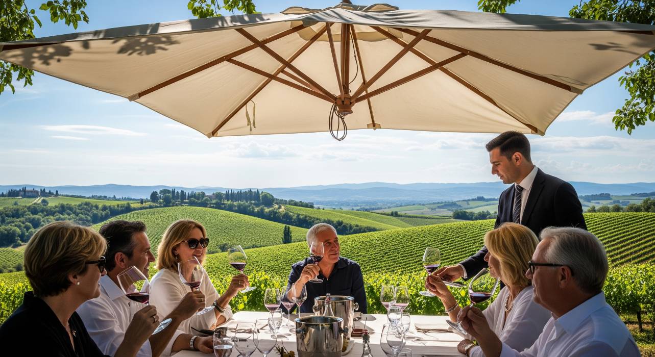Guests experiencing authentic Italian journeys crafted for discerning clients by Nancy Aiello Tours: a multigenerational family enjoying a private wine harvest in an Italian vineyard, and a couple on a balcony having a curated romantic dinner with scenic views, highlighting exclusive access and local connections from a luxury Italian travel agency.